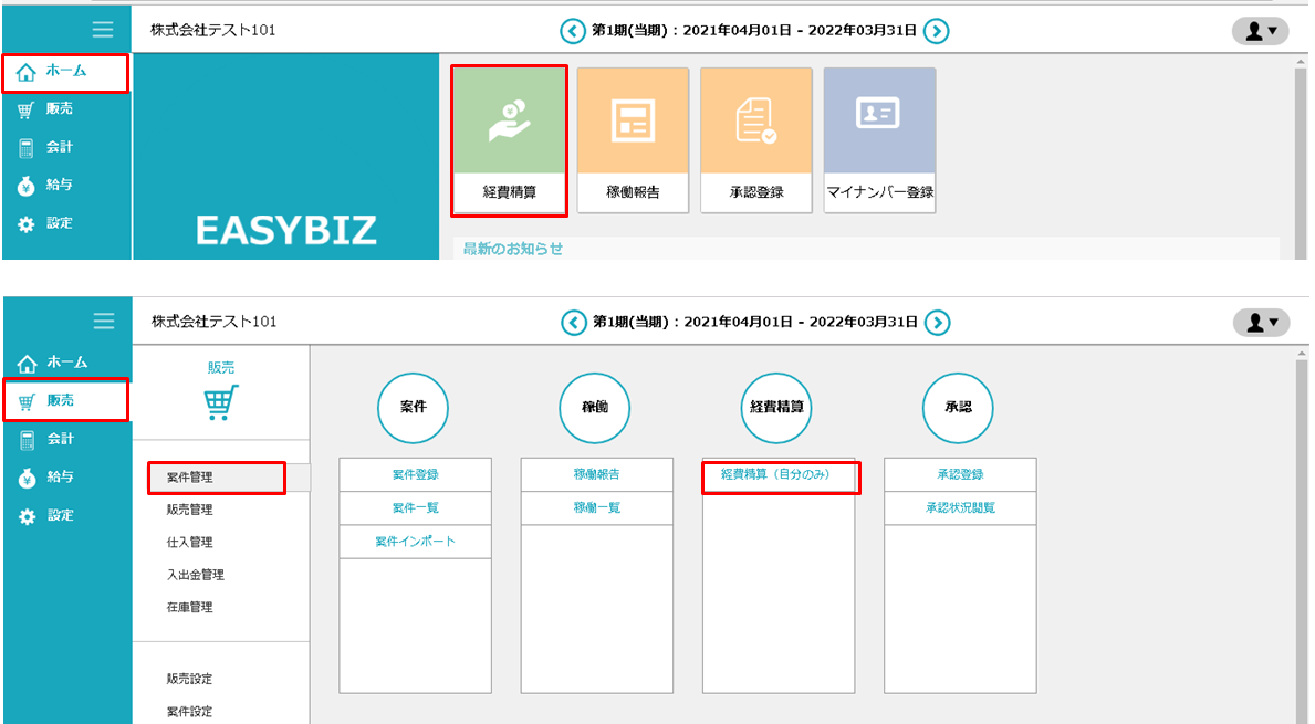 ① ホーム画面の「経費精算」、もしくは「販売」>「案件管理」>「経費精算(自分のみ)」に