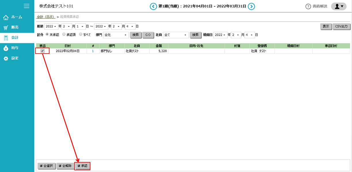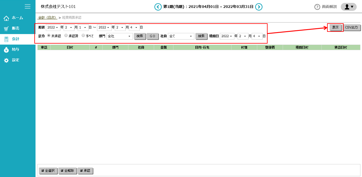 ① 「会計」>「日時」>「経費精算承認」にアクセスします。
