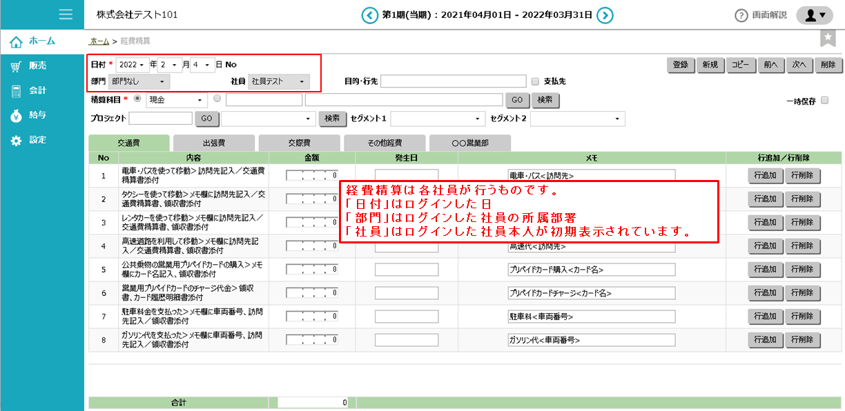 経費精算は各社員が行うものです。ホーム画面や、案件管理からアクセスした経費精算画面では、 部門はログインした社員の所属部署、社員はログインした社員本人がセットされており、変更することができません。
