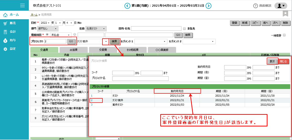④ 承認済みの経費精算データは、「販売」>「案件管理」の案件登録画面で、「直接経費(実