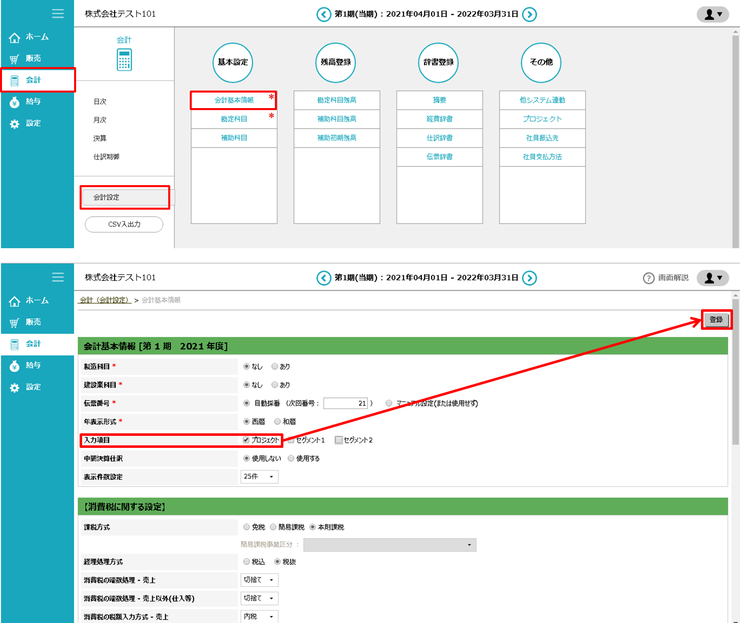 プロジェクト欄が表示されていない場合は、「会計」>「会計設定」>「会計基本情報」の、入力項目をご確認ください。 「プロジェクト」にチェックを入れ、「登録」ボタンをクリック、登録内容を確認後、「確認」ボタンをクリックすることで、経費精算画面にプロジェクト欄が表示されるようになります。