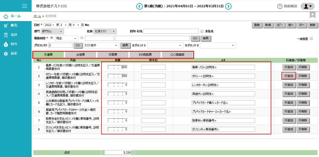 同じ経費内容で複数入力する場合は、「行追加」ボタンをクリックして行を追加します。