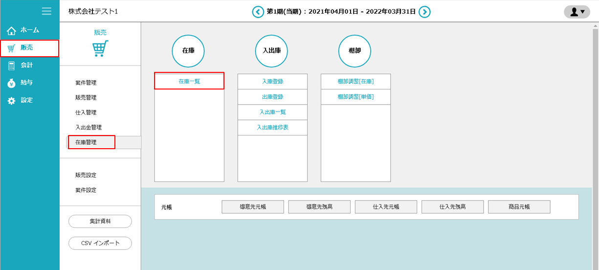 ① 「販売」>「在庫管理」>「在庫一覧表」にアクセスします。