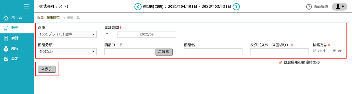 ② 各項目に検索したい商品の情報や条件を入力し、「表示」をクリックします。