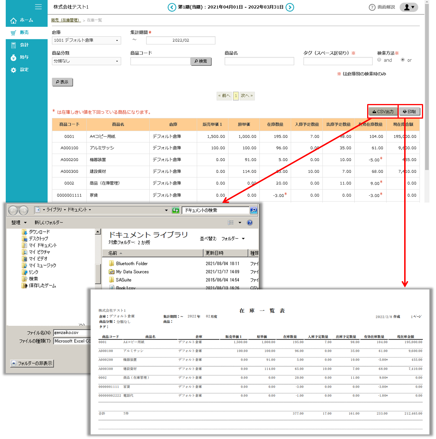 ③ 画面下部に対象期間の在庫一覧表を表示します。一覧のCSV出力や印刷も可能です。