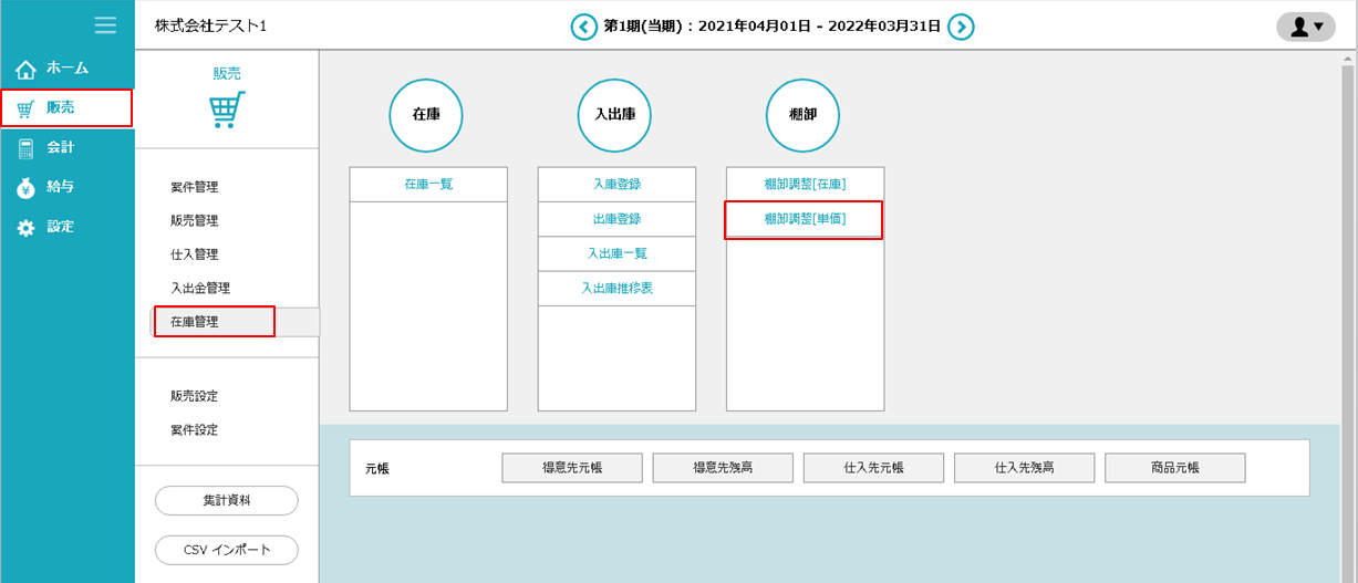① 「販売」>「在庫管理」>「棚卸調整[単価]」を押下してください。