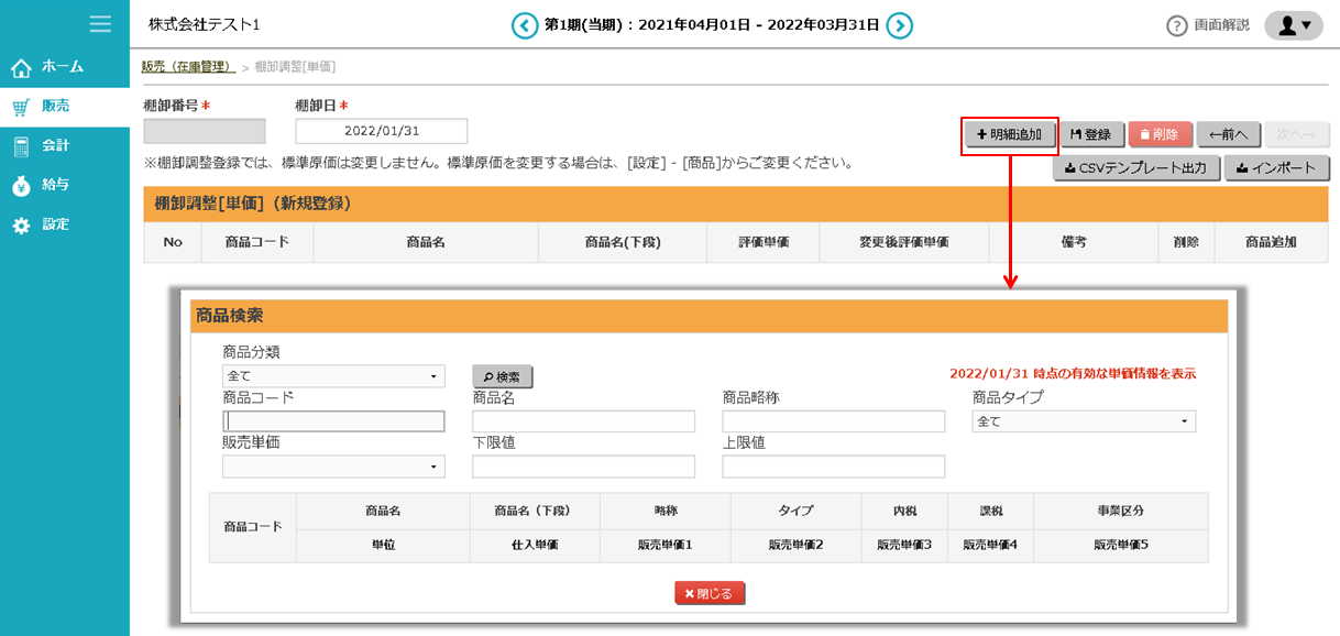 ② 「明細追加」ボタンを押下すると、「商品検索」画面が表示されます。