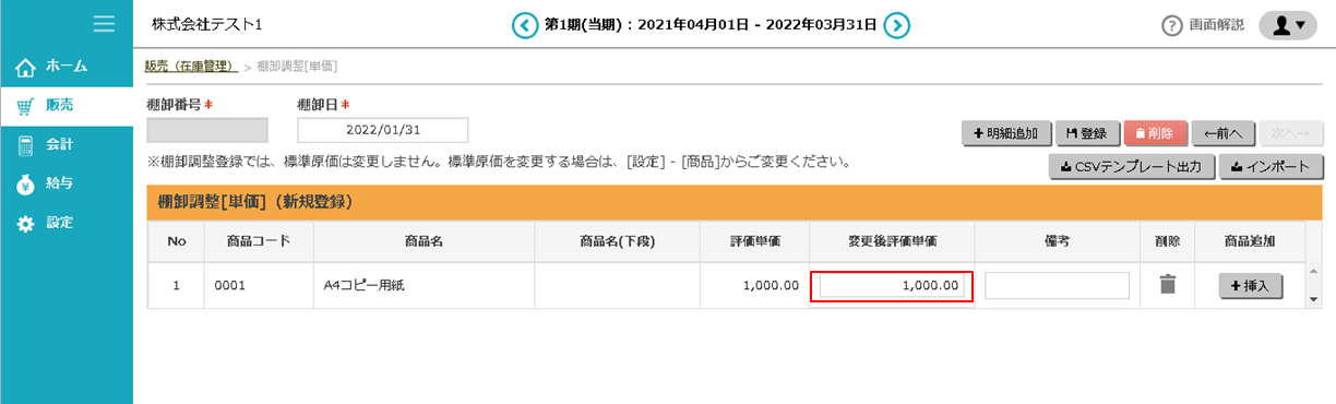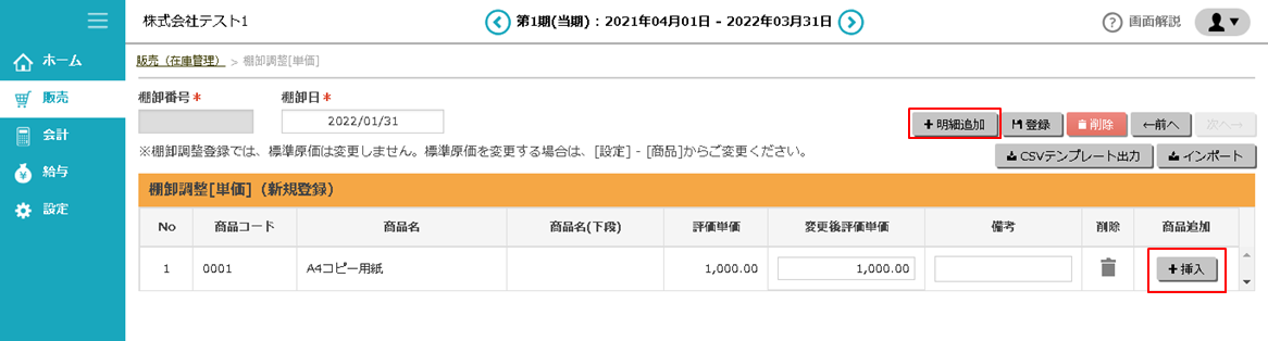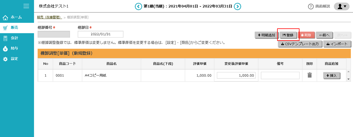 棚卸調整したデータの表示・作成・削除・CSVテンプレート出力・CSVインポートができます。