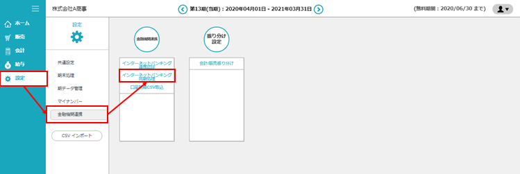 ①「設定」>「金融機関連携」>「インターネットバンキング同期処理」にアクセスします。