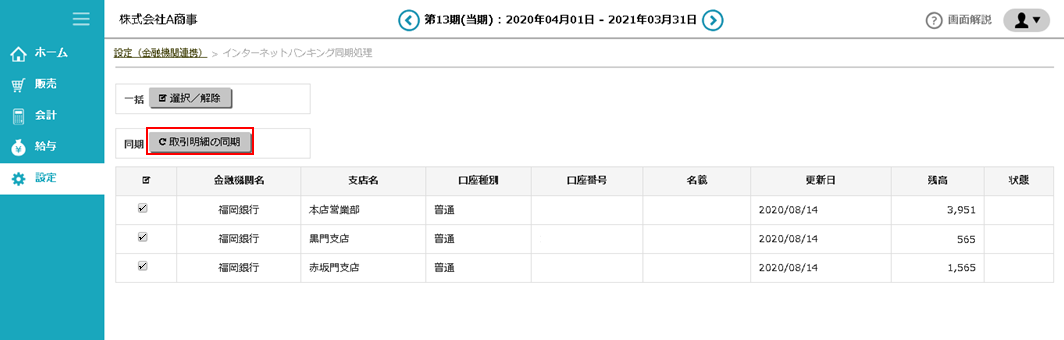 ② 同期処理したい口座にチェックする、もしくは、一括「選択/解除」をクリックします。