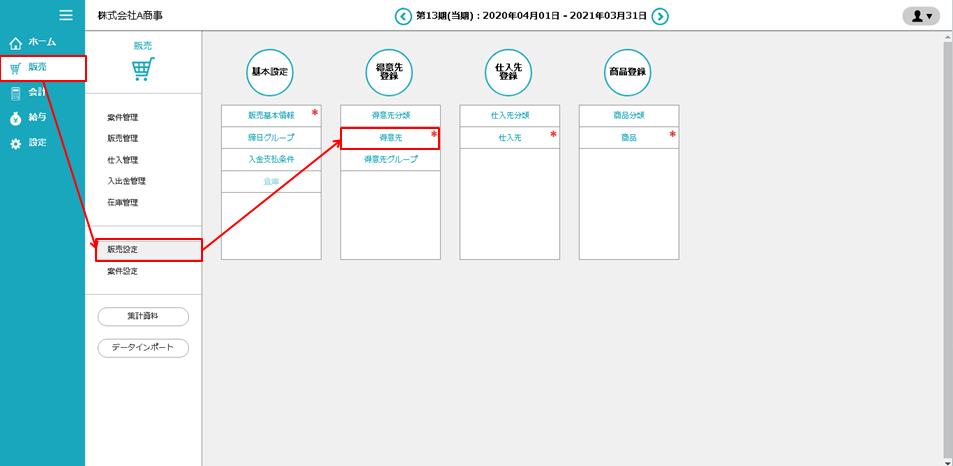 ①「販売」>「販売設定」>「得意先」にアクセスします。