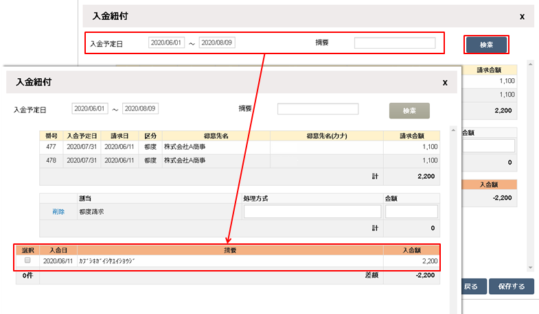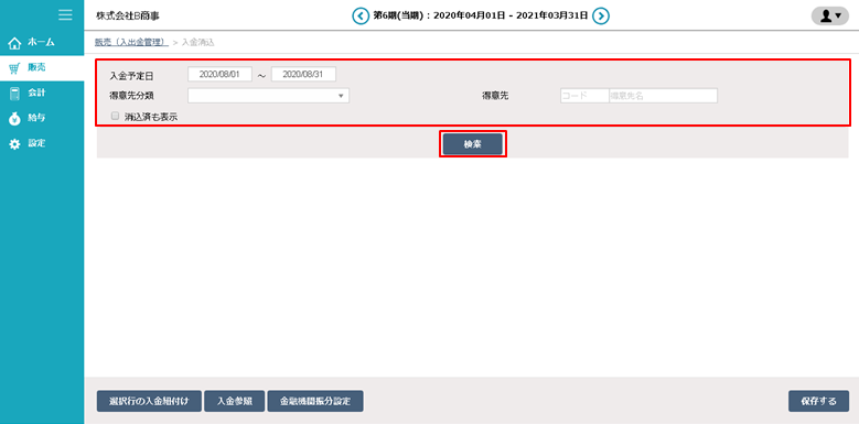 「入金予定日・摘要」を入力し、「検索」ボタンをクリックします。