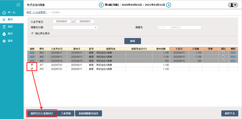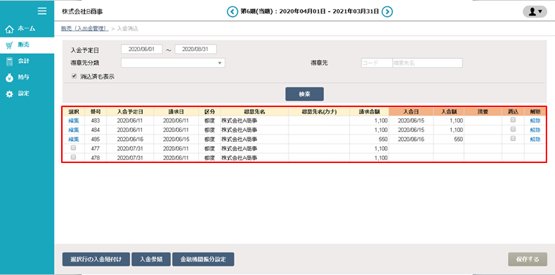 ①「販売」>「販売管理」>「入金消込」にアクセスします。