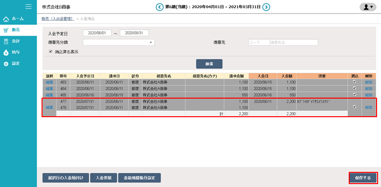 ⑦ こちらの画面で入金消込の内容を確認し、「保存する」をクリックします。
