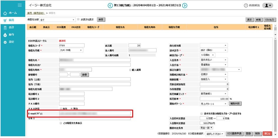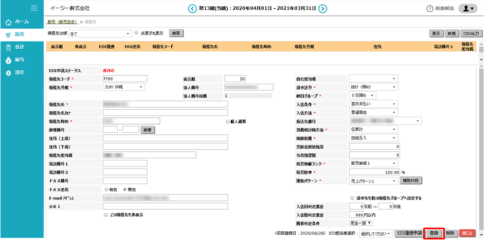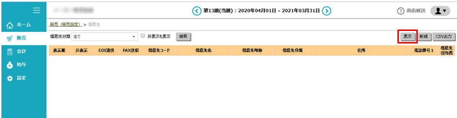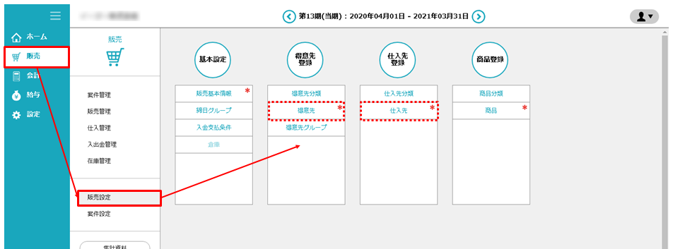 ① 「販売」>「販売設定」>「得意先」又は「仕入先」をクリックします。