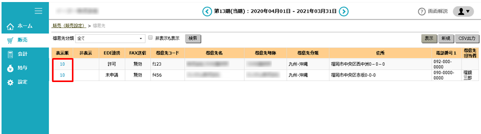 ③ 編集したい得意先・仕入先の「表示順」の数字をクリックします。