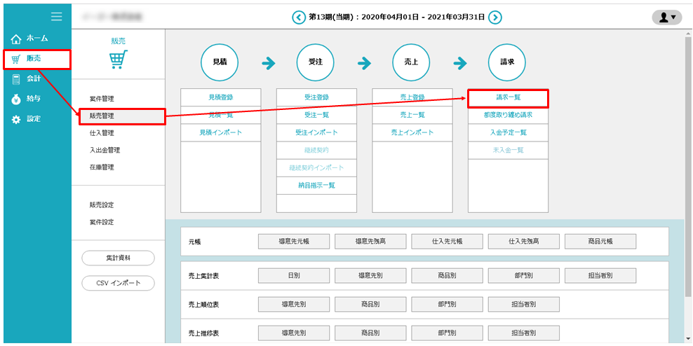 ① 「販売」>「販売管理」>「請求一覧」を開きます。