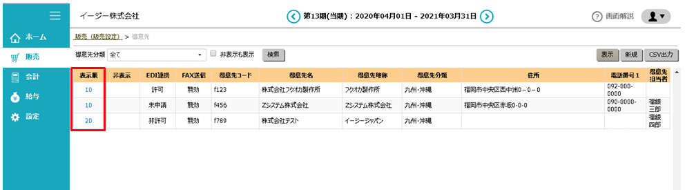 ② 送信先を確認したい取引先の「表示順」をクリックします。