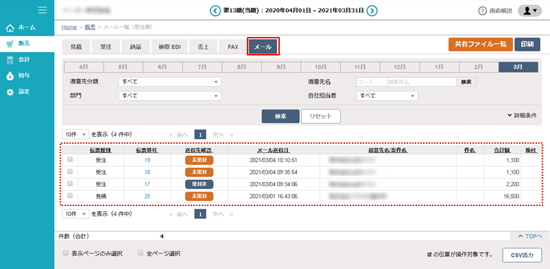 メール送信後に該当の登録を削除すると、相手も該当の帳票情報は閲覧できなくなります。