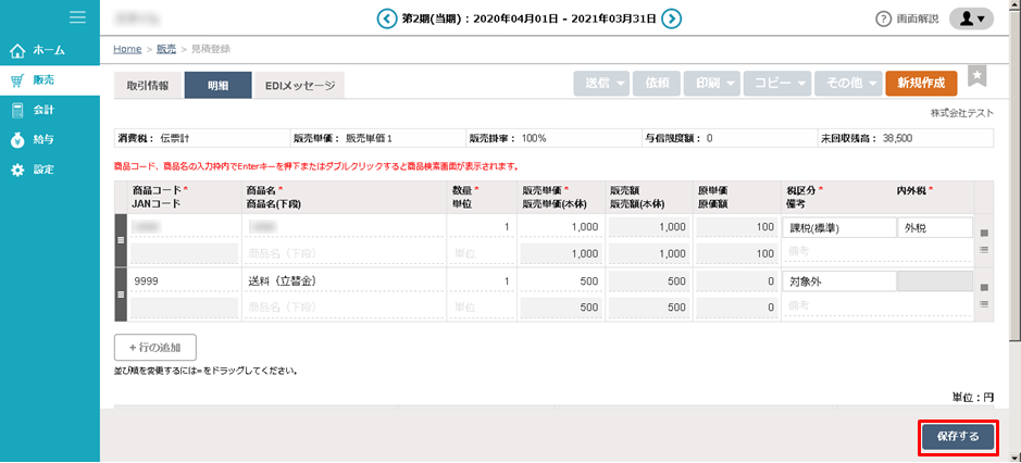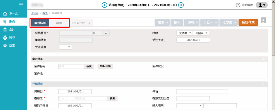 登録画面:見積登録,受注登録,売上登録,発注登録,仕入登録
