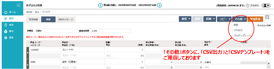 ・CSVテンプレート…発注インポートに用いることができる形式でCSVテンプレートを出力します。