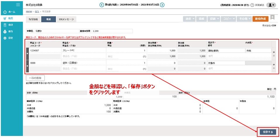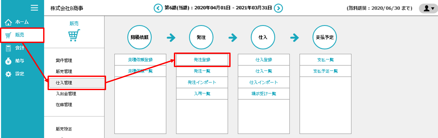 1.「販売」>「仕入管理」>「発注登録」をクリックします。