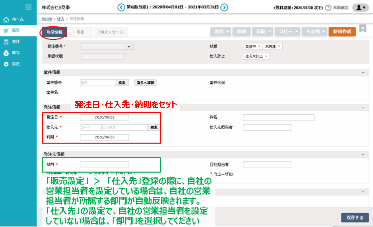 発注の「取引情報」タブの必須項目は「発注日」「仕入先」「納期」「部門(自社の担当部門」です。仕入先をセットすると、仕入先に設定している取引条件が自動反映します。必須項目以外の項目は、必要に応じて入力または修正します。
