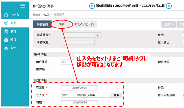 「取引情報」に仕入先をセットすると「明細」タブに移動ができます。「取引情報」タブで仕入先をセットした時に、画面右下の「保存」ボタンを押さなくても、仕入先をセットした情報を保持したまま、「明細」タブに移動できます。