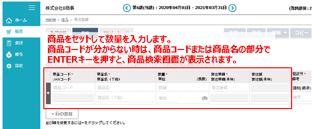 商品コード・商品名がわからない場合は、登録する商品明細行でエンターキーを押していただくと、商品検索画面が表示されます。