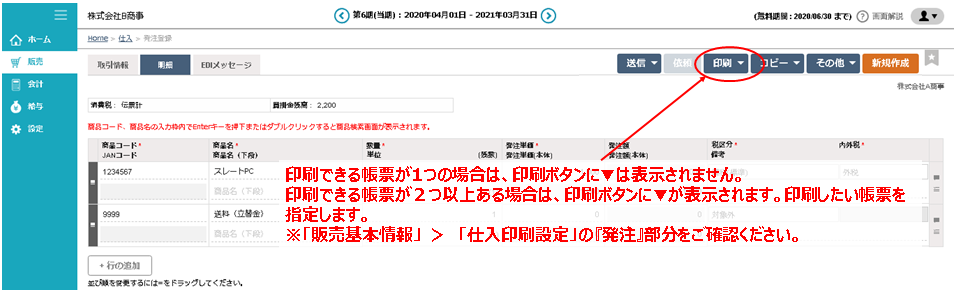 「販売設定」>「販売基本情報」>「仕入印刷設定」の『発注』に関する印刷設定で、