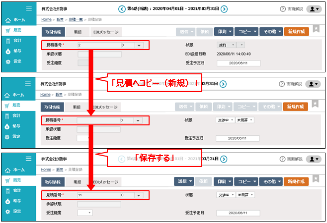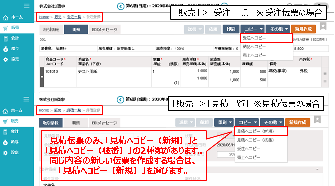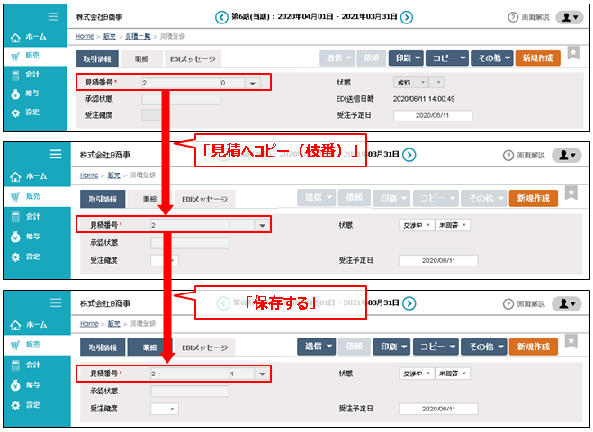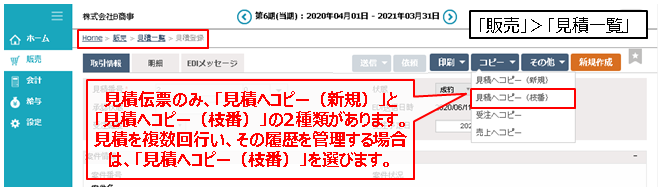 見積のみにある特殊な機能です。他の伝票と異なり伝票番号に枝番管理機能があります。このコピーにより、見積を何度も行った場合の履歴が管理できます。