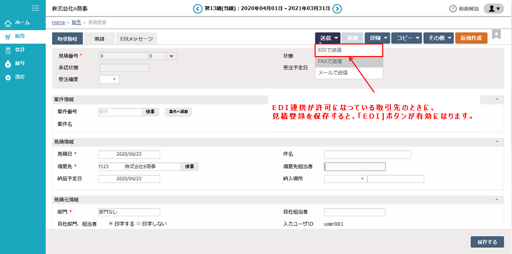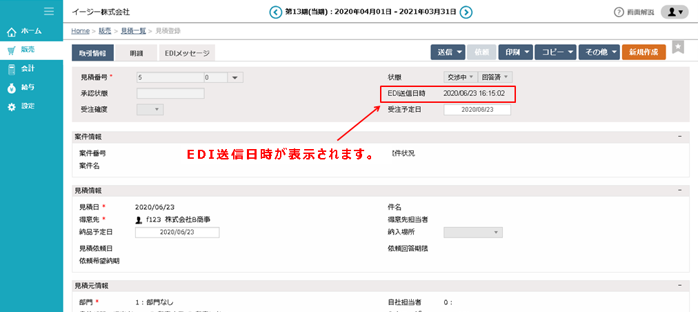 ⑤ EDIで見積書を送信すると、見積登録の「取引情報」にEDI送信日時が表示されます。