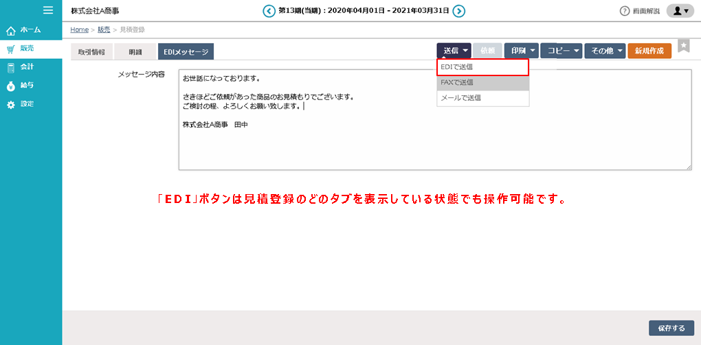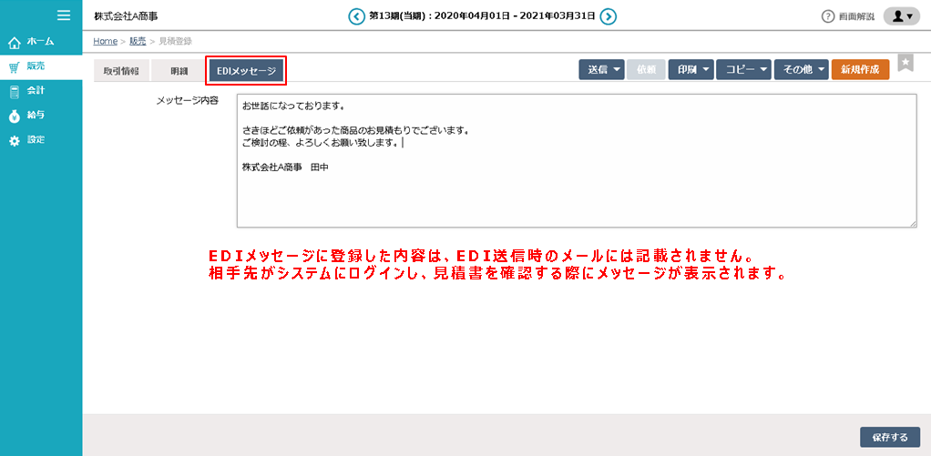 EDIメッセージに登録した内容は、EDI送信時のメールには記載されません。相手先がシステムにログインし、見積書を確認する際にメッセージが表示されます。