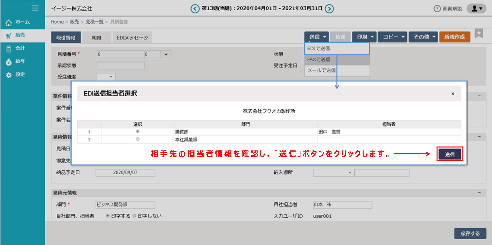 ④ 相手先の担当者情報を確認し、「送信」ボタンをクリックします。
