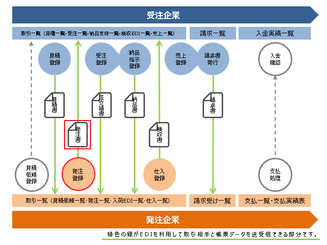 自社のEASYBIZシステムの「発注登録」の情報を、EDIを利用して送信することができます。
