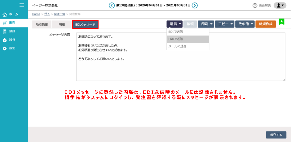 ② 必要に応じて「EDIメッセージ」で相手に伝えたい事柄を入力します。