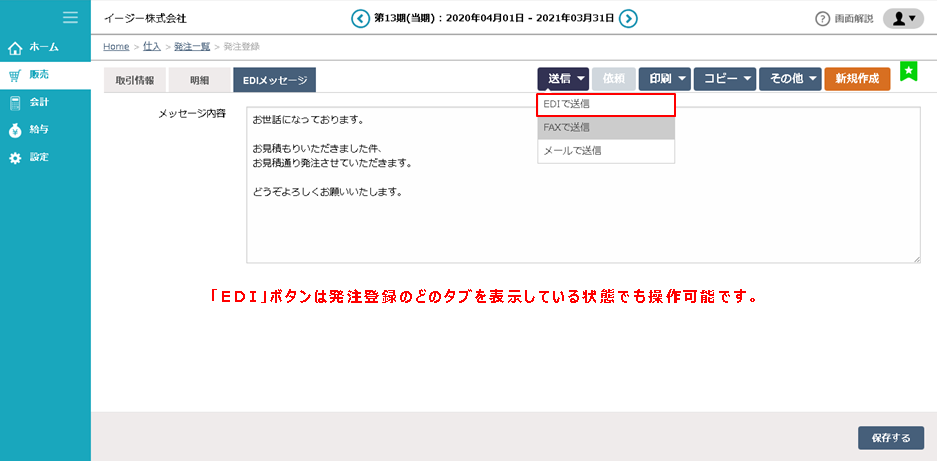 ① 発注伝票が「保存」されている状態で「EDI」ボタンが有効になります。