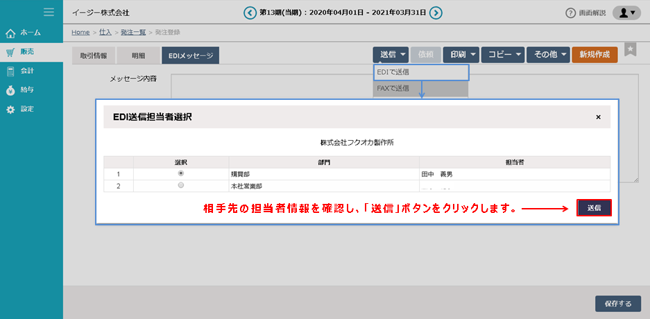 ④ 相手先の担当者情報を確認し、「送信」ボタンをクリックします。