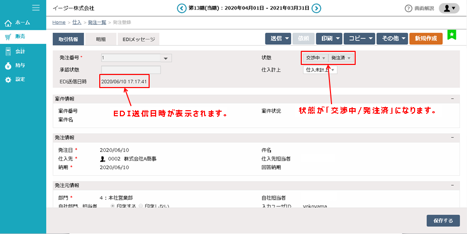 ⑤ EDI送信を実行すると、発注登録のヘッダーにある「状態」が「交渉中/発注済」になり、